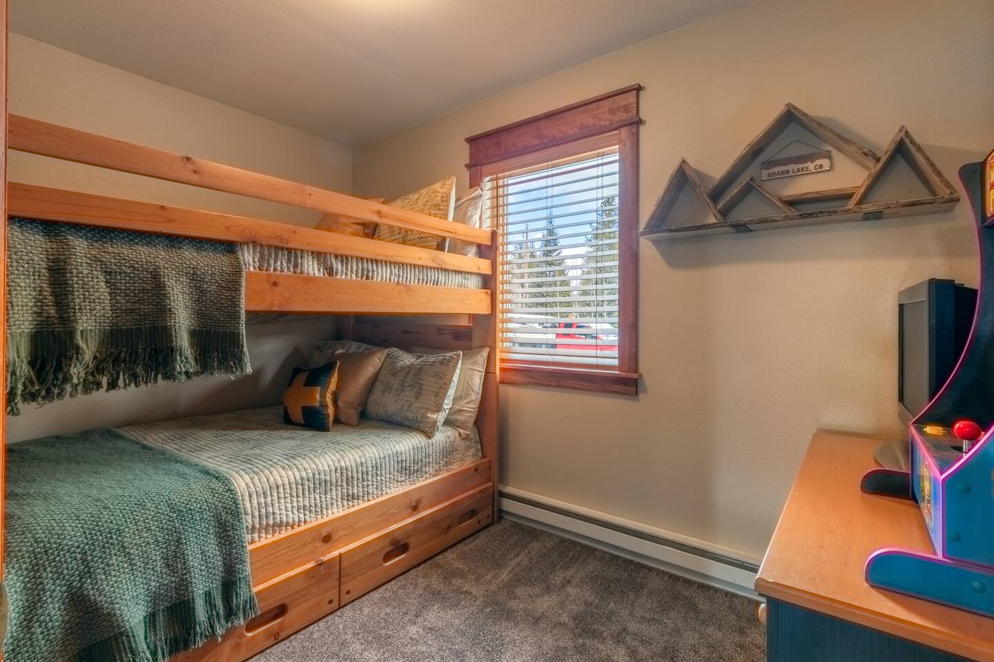 Welcome to our cozy cabin retreat on the north shore of Lake Granby—a place our family has poured our heart and soul into, and one we’re thrilled to share with you. This single‑story, 1,400 sq. ft. home is more than a getaway… it’s a feeling. A deep breath. A slowing down. A place where memories settle in and stay for a while. The original part of the cabin was built in 1954, and the moment you step inside you’ll feel that nostalgic, wood‑paneled charm wrap around you. Whether you’re curled up in the living room or unwinding in the sunroom, there’s a sense of warmth and “this is exactly where I want to be” that’s hard to put into words. The sunroom is one of our favorite places in the home. From here, you can watch the meadow, the mountains, and Lake Granby all in one sweeping view. Pour a cup of coffee, settle into a chair, and keep your eyes open—elk, deer, moose, and even coyotes wander through the backyard and down into the meadow. It’s a front‑row seat to true Colorado living. The bedrooms and master bath are part of the newer addition, blending modern comfort with cabin charm. You can snuggle into the cozy king bed in the primary suite, tuck into the full bunk bed in Bedroom 2, or relax in the queen + twin bunk setup in Bedroom 3. Every mattress, pillow, and set of linens is recently updated—we want your sleep to feel as restorative as the view. If you need to work remotely, the sunroom includes a dedicated workspace with a desk and a backdrop that makes video calls something you actually look forward to. Step outside and you’ve got one acre of Colorado to explore. Lounge near the basketball court at the picnic table, sip your favorite drink on the deck while you take in the meadow below, or wander over the little bridge and let the kids practice casting into the canal that runs beneath it. It’s playful, peaceful, and a little bit magical. Inside, the kitchen is equipped with all new appliances, making meal prep easy and enjoyable. The window over the sink frames a beautiful view of Lake Granby—cooking rarely feels this special. And yes… we’ll admit it: we get excited about parking. The round‑about driveway makes it simple to bring cars, trucks, trailers, boats, and any other mountain toys you’re traveling with. What we love most about this cabin is the balance—it’s surrounded by trees yet opens to spectacular views of the lake, meadow, and mountains. It has character and comfort, history and freshness, adventure and serenity. We might be biased… but to us, this place is a 10 out of 10 when it comes to Airbnb vibes, views, and experience. We hope you feel the same from the moment you arrive.